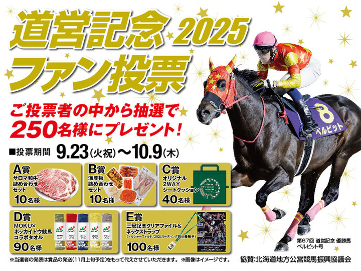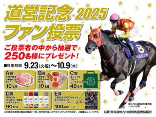 第68回道営記念(11月6日実施)の出走馬ファン投票を9月23日(火祝)より実施いたします。投票に参加された方の中から、抽選で合計250名様に以下の賞品をプレゼントいたしますので、たくさんのご応募をお待ちしております。