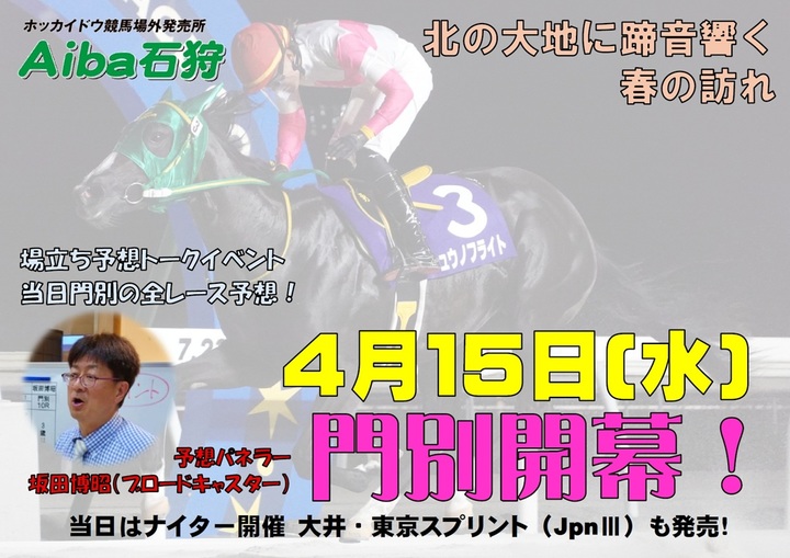 Aiba石狩イベントについて(4月15日) イベント 2026.04.13 Aiba石狩では、4月15日(木)に門別開幕イベントを実施いたします。ブロードキャスター坂田博昭さんによる場立ち予想トークを行いますので、皆さまぜひお越しください。